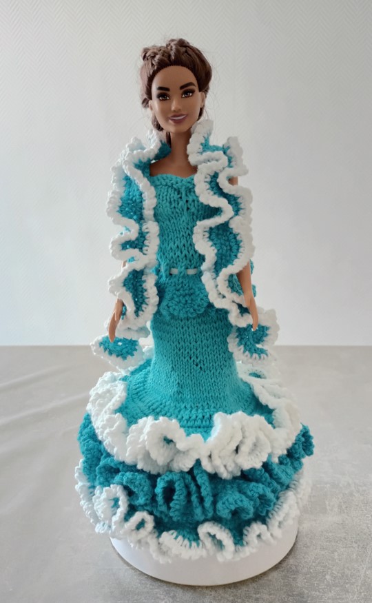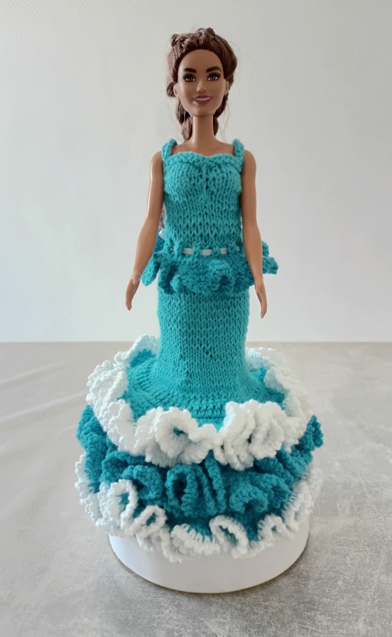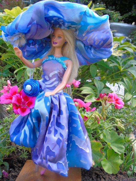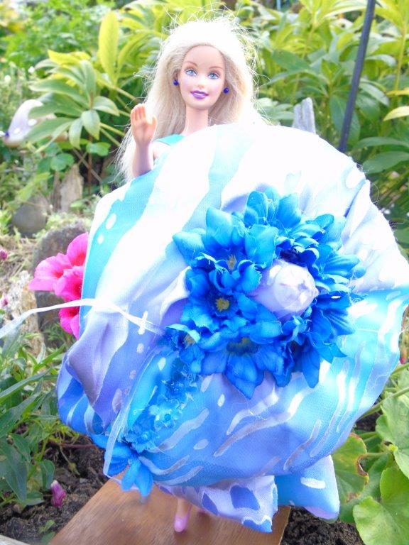 Voici ma 1ere création : Barbie Froufrou bleu, en tissu léger allant du bleu