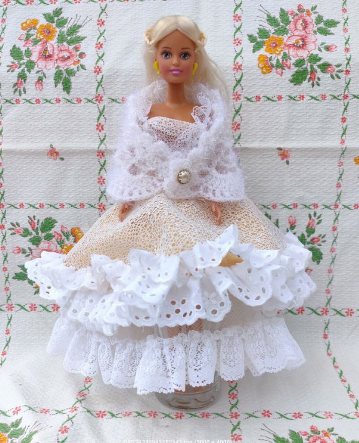 Puis vient l’ajout du corsage ,un peu caché par un châle réalisé au crochet