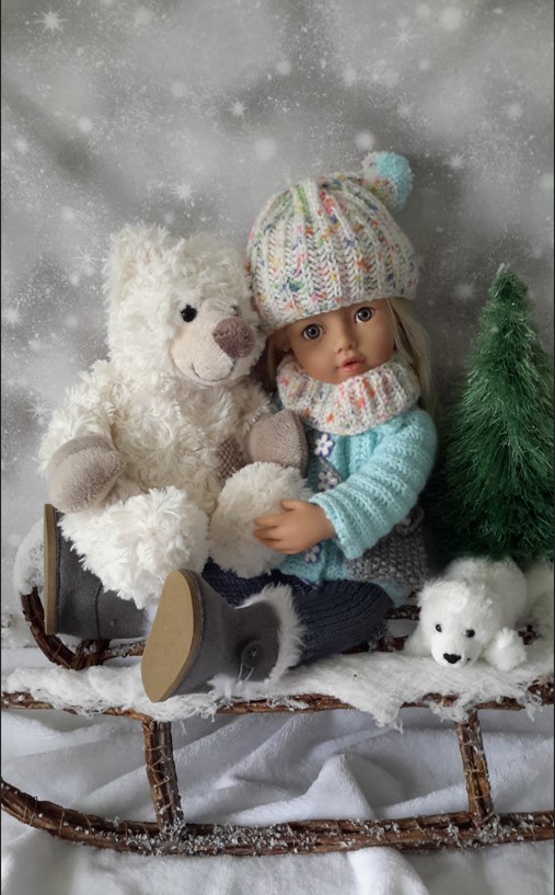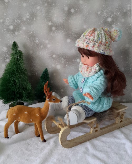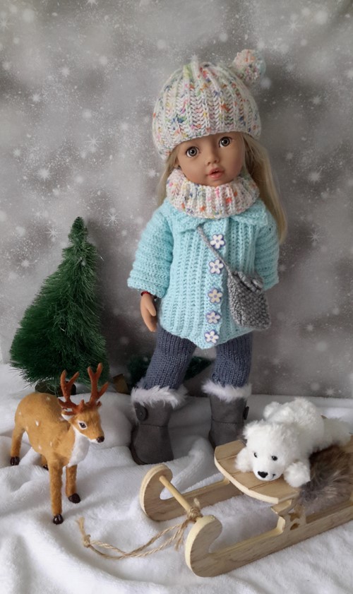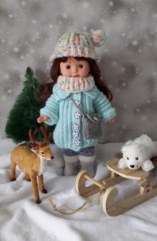 une petite miss (32cm) version manteau et le bonnet avec revers