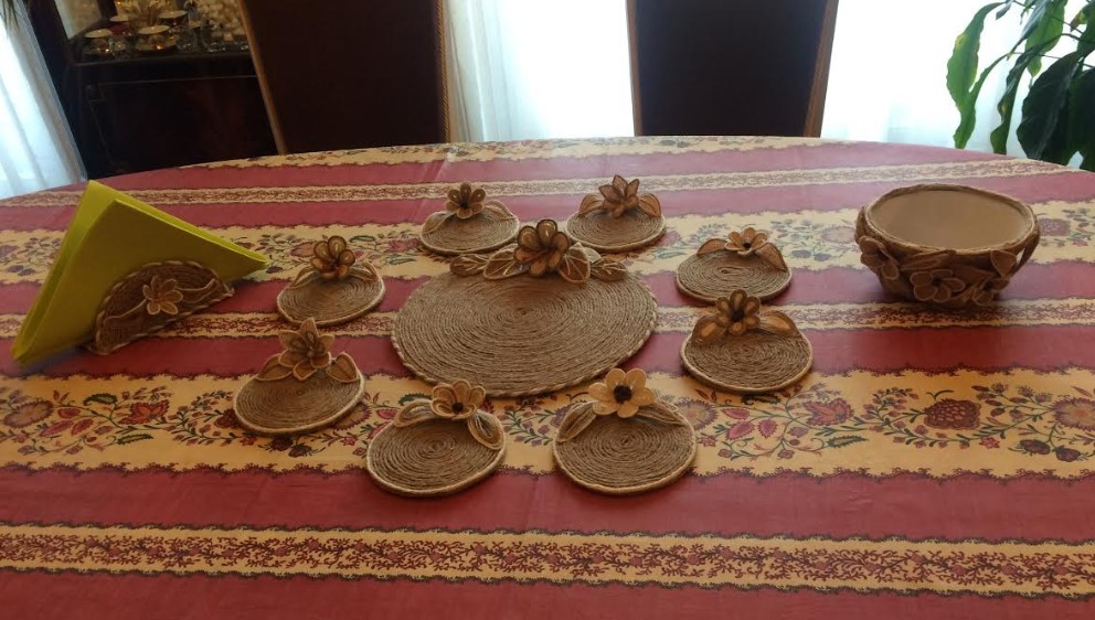 Les dessous de verre, les sous-plat et le petit bol sont en ficelle de